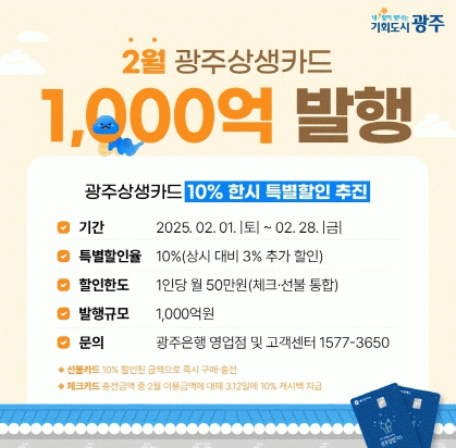 광주광역시는 시비 100억원을 투입해 2월 한 달간 광주상생카드 10% 특별할인을 연장 시행한다. 기존 광주상생카드 할인율은 7%다.