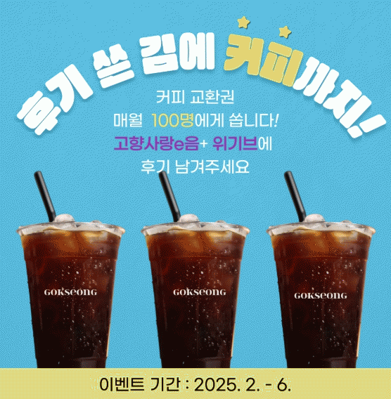 ▲10만 원 이상 기부자에 대해 ▲매달 100명 무작위 추첨해 ▲5천 원권 커피 쿠폰을 지급한다. 참여 방법은 고향사랑e음, 위기브 또는 전국농협에서 곡성군 고향사랑기부 10만 원 이상 기부한 후 배송된 답례품에 대한 후기를 작성하면 된다.