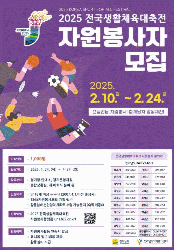 지원 자격은 18세 이상 누구나 가능하며, 신청은 ‘2025 전국생활체육대축전 자원봉사 플랫폼’에서 온라인으로 접수하거나, 각 개최 시군 자원봉사센터를 방문해 신청할 수 있다.