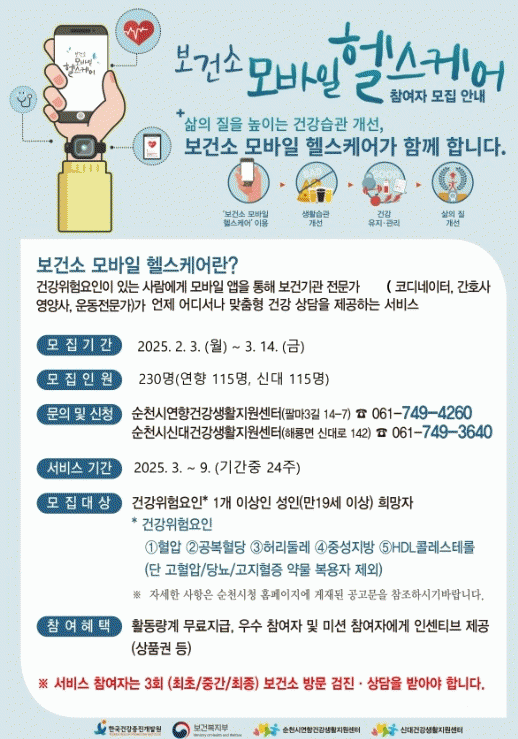 모집대상은 건강위험요인(혈압옺編므榻?허리둘레왒鈒봐峙?HDL콜레스테롤)을 가진 만 19세 이상 순천시민 또는 순천시 소재 직장인으로 단, 해당 질환을 진단받은 자나 치료를 위한 약물 복용자는 제외된다.