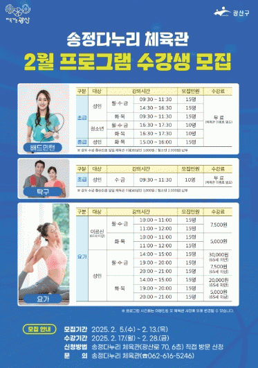 신청 대상은 13일까지 주민 누구나 신청할 수 있으며 송정다누리체육관(광산구 광산로 70, 6층)에서 선착순으로 현장 접수하고 있다.