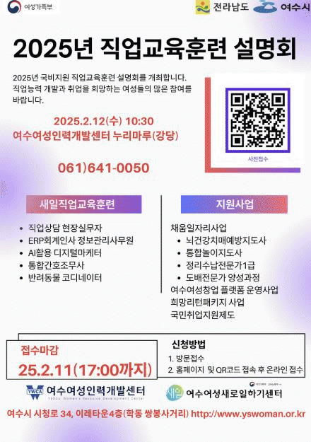 여수시에 따르면 이번 설명회는 취업과 창업을 희망하는 여성 구직자를 대상으로 하며 직업교육훈련 과정과 유망 직종 정보, 1:1 맞춤형 상담 서비스를 제공한다.