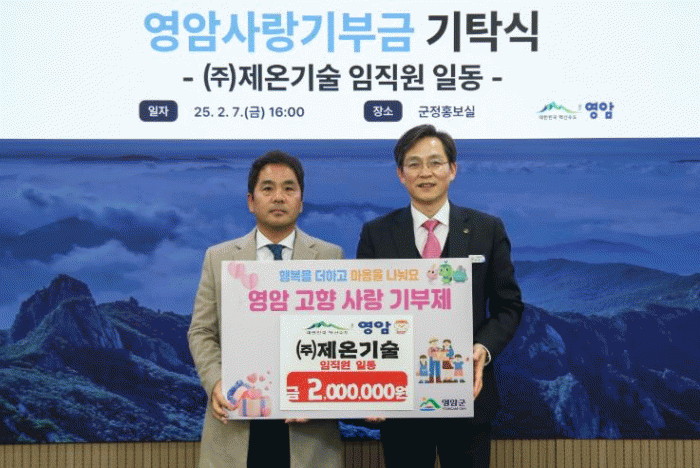 원경희 ㈜제온기술 대표는 “영암군에서 근무한 경험이 기업을 성장시키는 발판 역할을 했다. 친정같은 영암군이 기부금을 유용하게 써주길 바란다‘라고 말했다.