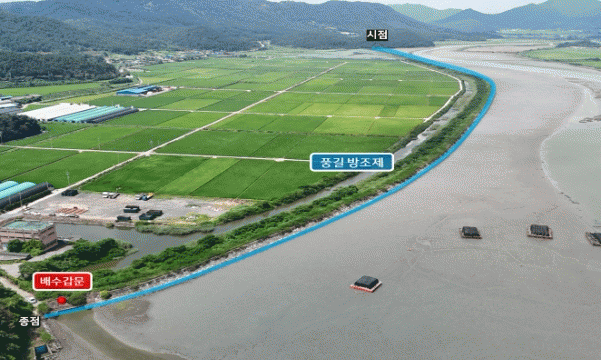 이번 사업은 과거 2024년 9월 19~21일까지 최고 345mm 및 시간당 최고 62mm를 기록해 많은 농경지침수가 일어났으며, 특별재난지역으로 선포될 만큼 재해예방을 위한 방조제 개보수가 시급한 지구였다.