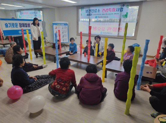 교육은 보건소 지역사회 중심재활 전문 인력이 보건진료소를 방문하여 ▲낙상 예방 교육 ▲스포츠 스태킹 활용 균형 교육 ▲일상생활 속 균형증진 및 근력강화 운동 ▲근골격계 통증 완화를 위한 테이핑 요법 ▲장애인식개선교육 등 알찬 내용으로 구성했다.