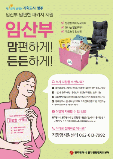 ‘맘편한 패키지’는 지역 사회적기업이 제조한 임산부 맘편한 의자, 직장생활꾸러미를 지원하고, 임산부 모·부성보호 관련 무료 노무상담을 진행한다.