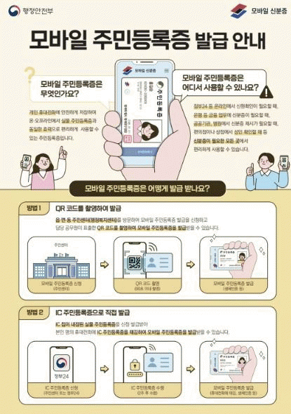 모바일 주민등록증은 오는 3월 28일부터 전국적으로 확대될 예정으로 정부24 및 주민등록지와 상관없이 전국 읍면동 주민센터 어디에서나 발급받을 수 있다.