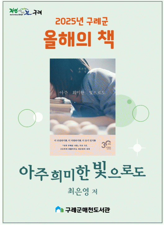 구례군민들은 매천도서관 홈페이지 및 도서관 방문을 통해 후보 도서를 추천했으며, 이후 지역 작가, 사서, 교사 등으로 구성된 도서선정위원회의 심사를 거쳐 최종적으로 최은영 작가의 『아주 희미한 빛으로도』가 선정됐다.