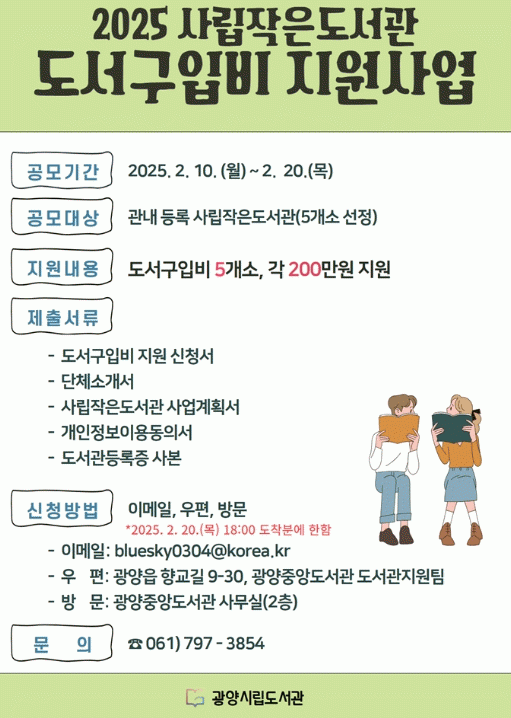 기타 자세한 사항은 광양시 도서관과 도서관지원팀으로 문의하면 된다.