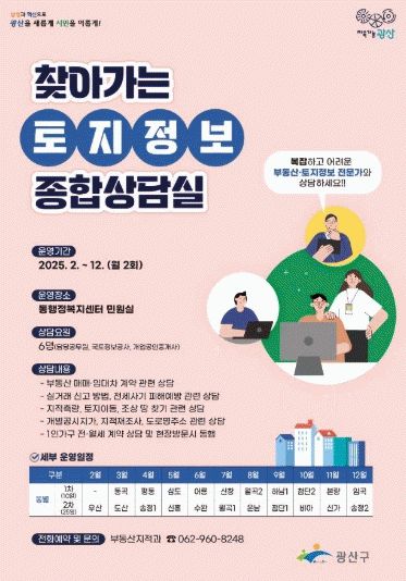 광산구 관계자는 “구청 방문이 어려웠던 노년층이나 시간이 바쁜 자영업자 등이 토지 관련 애로사항이 많았다”며 “찾아가는 토지 정보 종합상담실을 통해 정보를 얻어갈 수 있도록 많은 이용 부탁드린다”고 전했다.
