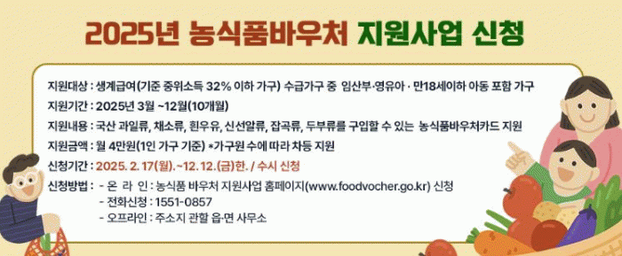 농식품바우처 지원사업은 취약계층 가구가 신선한 농축산물을 쉽게 구매할 수 있도록 관내 지정된 가맹점에서 채소, 과일 등 농식품을 구입할 수 있는 바우처 카드를 지원하는 사업이다.