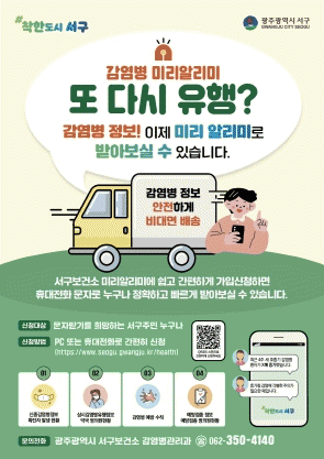 서구는 감염병 정보를 담당하는 공무원을 따로 지정해 주민들에게 주1회 이상 휴대전화 문자로 정보를 제공할 예정이다. 서구민 누구나 광주 서구보건소 누리집(보건소사업-감염병관리사업-감염병 미리알리미 안내)에서 ‘미리알리미’ 서비스 신청이 가능하며, 신청자는 정기적으로 감염병 유행 상황 및 예방수칙, 예방접종 정보, 치료기관 안내 등의 내용을 문자로 받아볼 수 있다.