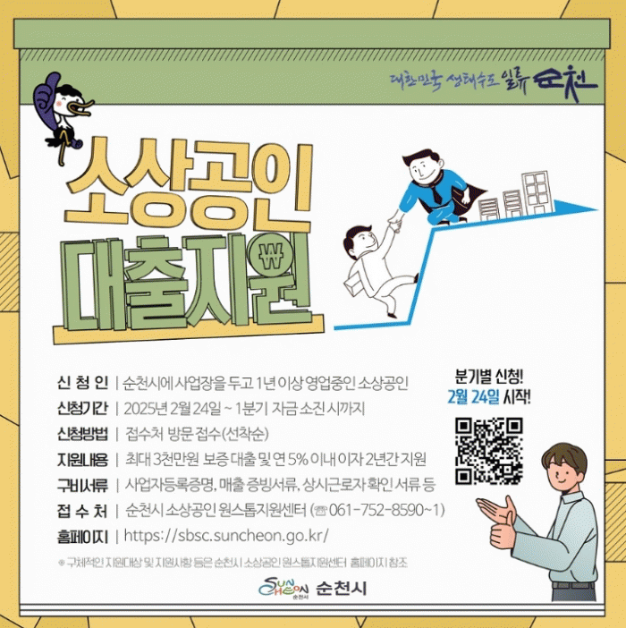 자세한 내용은 시 누리집 공고란에서 확인하거나, 순천시 소상공인원스톱지원센터로 문의하면 된다.