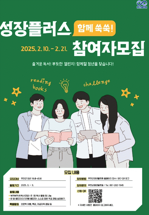 ‘성장플러스’는 독서 모임(북적북적넷)과 자기계발 챌린지(한 달 챌린지) 두 가지 프로그램으로 구성되며, 무안군에 거주·재직·재학 중인 19세부터 45세 청년을 대상으로 진행된다.