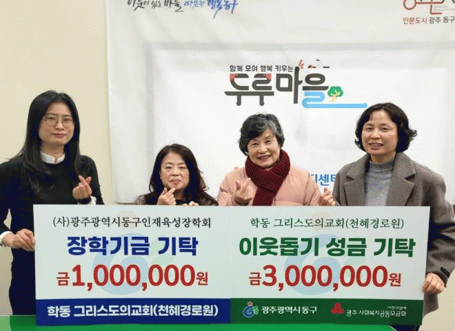 김민정 학동장은 “도움이 필요한 우리 이웃을 위해 기탁해 주신 천혜경로원에 감사드린다”면서 “장학금은 동구 인재육성장학회에 전달하고, 이웃돕기 성금은 광주 사랑의열매를 통해 향후 관내 어렵고 소외된 이웃을 위한 다양한 복지사업에 소중히 사용하겠다”고 말했다.