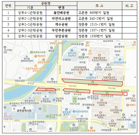 또 쌍촌동 상무2-2근린공원, 상무2-3근린공원, 상무2-4근린공원은 계수공원, 무진푸른공원, 상암공원으로 새 이름을 붙였다. ‘계수공원’은 인근 계수마을에서 이름을 따왔으며, 무진대로에 위치한 ‘무진푸른공원’은 전나무와 소나무 등 상록수가 우거져 사시사철 푸르름을 만끽할 수 있다. 또한 ‘상암공원’은 마을의 옛명칭인 ‘상암’을 공원 이름에 붙였다.