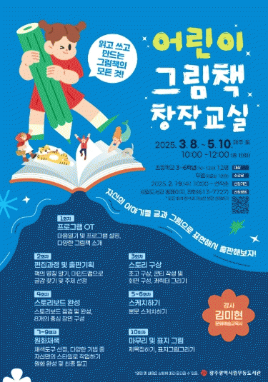 초등학교 3~6학년을 대상으로, 글쓰기?그리기 등 그림책 출판의 모든 과정을 경험할 수 있다. 특히 출간된 그림책은 시민들과 함께 공유할 수 있도록 전시회를 열 예정이다.