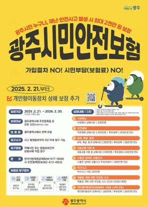 ‘광주시민안전보험’ 대상자는 광주광역시에 주소를 둔 시민(등록외국인 포함) 모두가 보장대상이다. 별도의 가입절차와 보험료 부담 없이 자동 가입되며, 광주 이외지역에서 발생한 사고도 보장받을 수 있다.
