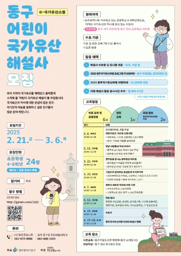 교육 일정은 지역의 국가 유산과 역사를 알아보는 ▲이론 교육 ▲현장 교육 ▲해설 실습 등 총 9회에 걸쳐 진행된다. 수료한 어린이는 오는 4월 25~26일에 열리는 광주 국가 유산 야행 ‘돌의(義) 시간’에서 ‘동구 어린이 국가 유산 해설사’로 활동하게 된다.