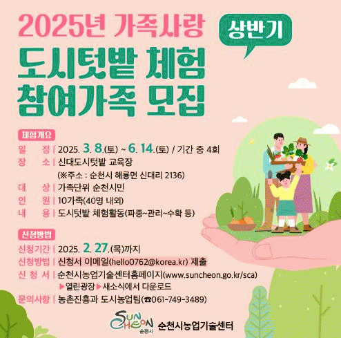 가족사랑 텃밭체험 프로그램은 오는 27일까지 전자메일을 통해 신청할 수 있으며, 순천시농업기술센터 누리집 공고문을 통해 보다 자세한 사항을 확인할 수 있다.
