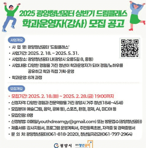 조동수 광양시 청년일자리과장은 “‘드림클래스’가 청년들이 자신의 경험과 역량을 공유하고 성장할 수 있는 기회가 되길 바란다”며 “강사 경험을 희망하는 청년들의 많은 관심과 참여를 기대한다”고 말했다.
