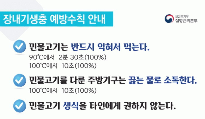 이를 예방하기 위해서는 ▲민물고기를 날것으로 먹지 않고 익혀서 먹기(90℃에서 2분 30초, 100℃에서 10초) ▲민물고기를 다룬 칼, 도마 등 조리 기구는 열탕 소독(100℃에서 10초) ▲민물고기 생식을 타인에게 권하지 않기 등의 예방 수칙을 지켜야 한다.