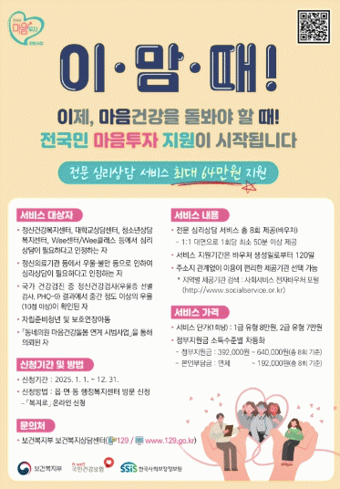 120일 동안 총 8회의 전문 심리상담을 받을 수 있는 바우처를 제공하며, 소득수준에 따라 본인부담금(0~30%)이 차등 적용된다.