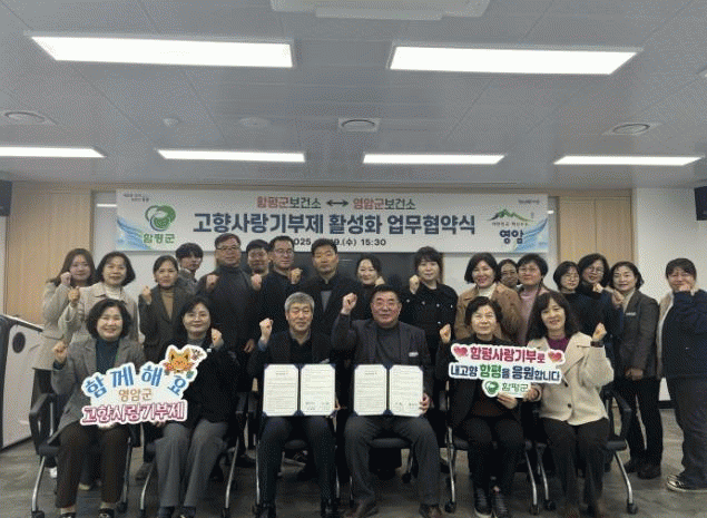 함평군은 20일 “함평군 보건소와 영암군 보건소가 함께 지난 19일 고향사랑기부제 활성화와 지자체 간 협력 강화를 위해 협약을 체결하고 상호 기부금을 전달했다”고 밝혔다.