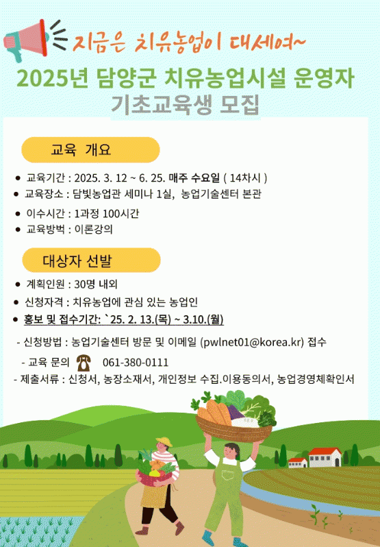 교육 이수자는 올해부터 시행되는 ‘우수 치유농업시설 인증제’의 필수 자격요건을 갖추게 되며, 이를 통해 전문적인 치유농업 시설로 인정받고 운영할 수 있다.