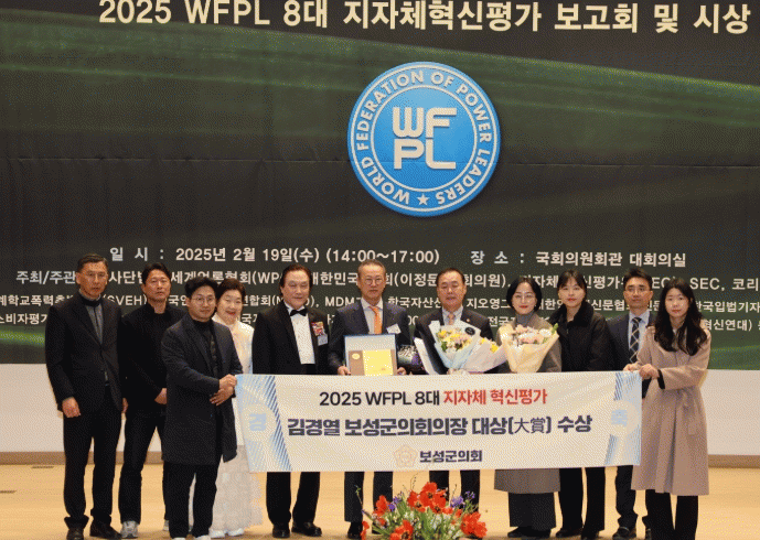 김경열 의장은 보성군의회에서 유일한 3선 의원으로서 풍부한 의정 경험을 바탕으로 군민 복지 증진, 지역 경제 활성화 정책 등 군민 중심의 의정활동을 적극적으로 추진하며 지방자치 발전에 앞장선 공로를 인정받아 수상의 영예를 안았다.