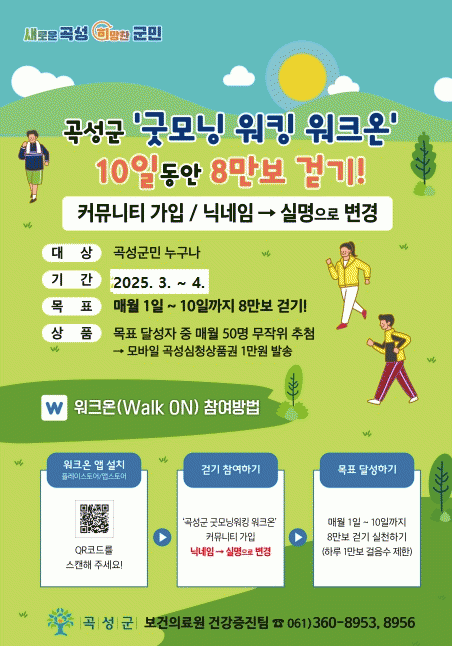 ‘곡성군 굿모닝 워킹 워크온’은 곡성군민 누구나 참여할 수 있으며, 1일부터 10일까지 8만 보 달성을 목표로 진행된다.