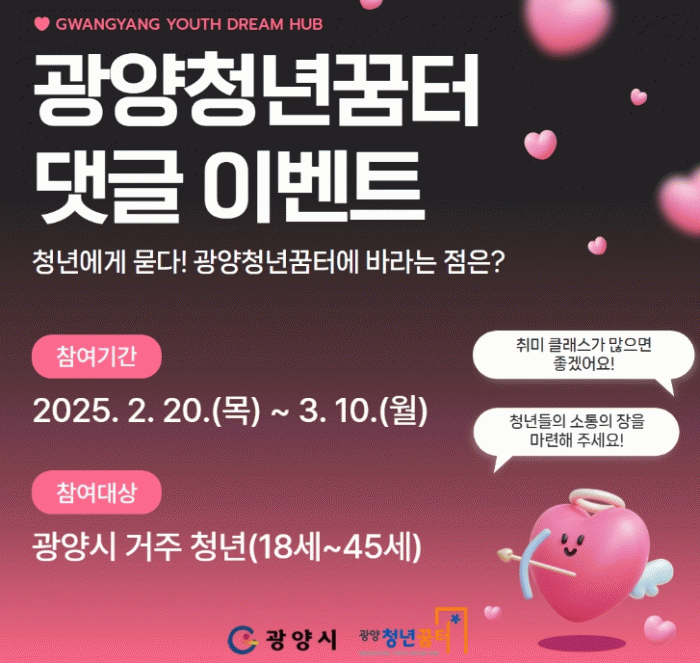 오영숙 광양청년꿈터 센터장은 “청년들의 의견이 직접 반영된 프로그램을 만들기 위해 이번 이벤트를 기획했다”며 “앞으로도 청년들과 지속적으로 소통하며 함께 성장할 수 있는 공간으로 자리매김하겠다”고 말했다.
