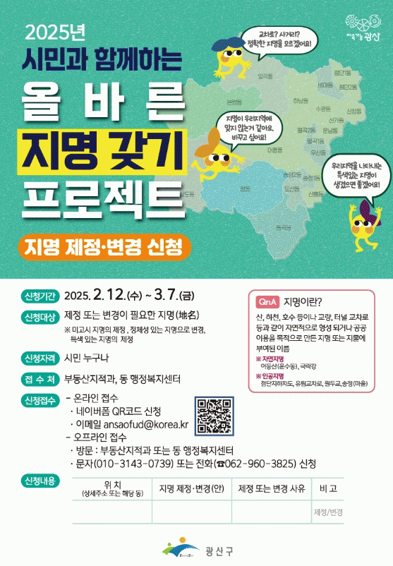 지명 갖기 사업에 대한 자세한 사항, 참여 문의는 광산구 부동산지적과에 하면 된다.