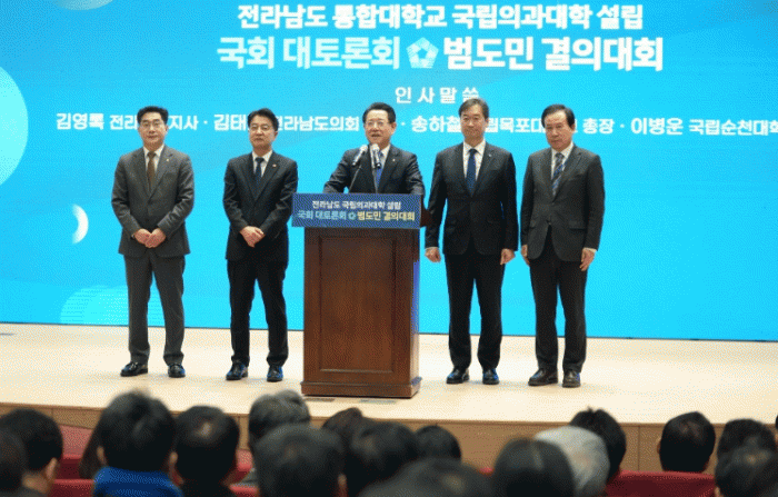 김영록 지사는 축사를 통해 “의료개혁은 정부가 이제 더이상 미룰 수 없는 절체절명의 과제”라며 “정부와 의료계가 대타협을 통해 의료문제를 해결하되, 이 과정에서 정부가 대국민 약속한 ‘전라남도 국립의과대학 설립’을 반드시 확정해줄 것”을 강력히 건의했다. 이어 “전남도는 국립의대 설립이 완수되는 그날까지 최선을 다하겠다”고 덧붙였다.