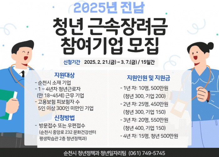신청 대상은 순천시에 소재하고, 만 18세 이상 45세 이하의 1~4년차 청년 근로자가 근속하고 있는 고용보험 피보험자 수 5인 이상 300인 미만인 기업이다.
