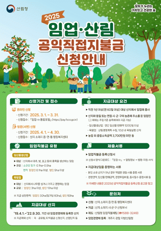 직불금 신청 관련 세부사항은 나주시 누리집 공고문에서 확인하거나 나주시 공원녹지과, 읍면동 행정복지센터 또는 산림청 전화상담센터로 문의하면 된다.