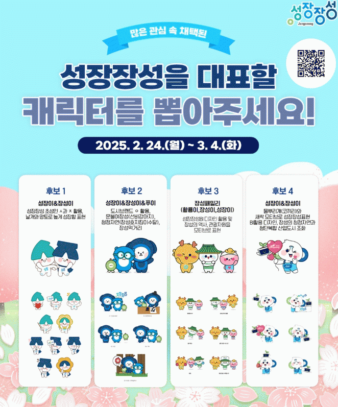 장성군은 지난해 새로운 도시브랜드 ‘성장장성’을 개발한 데 이어, 올해 ‘성장장성’과 연계하면서 친근하고 활기찬 캐릭터 개발에 나섰다. 군에 따르면 1월 공모대행 용역을 통해 총 215건의 응모작이 접수될 정도로 참여열이 뜨거웠다.