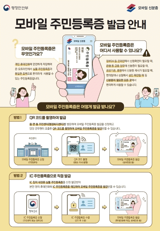 두 번째는 기존 실물 주민등록증을 이용하는 방식으로, 행정복지센터에서 발급용 QR 코드를 촬영하면 즉시 발급받을 수 있다. 단, 휴대전화를 교체하거나 앱을 삭제하면 재발급이 필요하다.