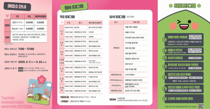 또한, 매화랑 2박 3일, 매실 담아 광양도시락, 광양 ‘맛’보기 등 광양의 정체성을 담은 오감만족 프로그램과 먹거리들도 시민과 관광객을 기다린다.