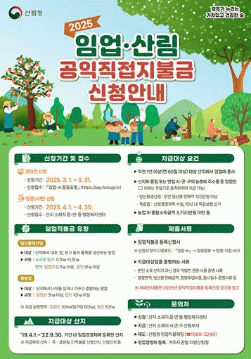 시 관계자는 “임업 직불금 혜택에서 누락되지 않도록 미리 자격요건과 구비서류 등을 확인해 기한 내 신청해 주시길 바란다”고 당부했다.