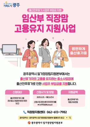 한편 광주시일가정양립지원본부는 임산부의 일가정양립을 위해 맘편한패키지를 지원하고, 원스톱 노무상담과 권리구제를 지원하는 등 일하는 부모들의 일가정 양립을 위해 다양한 사업을 지원하고 있다.