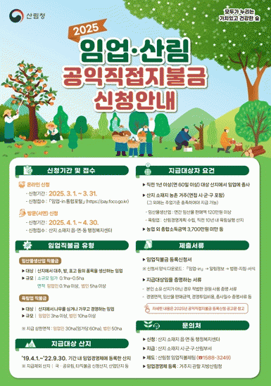 자세한 사항은 각 시군 산림부서와 읍면동 행정복지센터에서 확인할 수 있으며, 산림청 임업직불금 상담센터에서도 안내받을 수 있다.