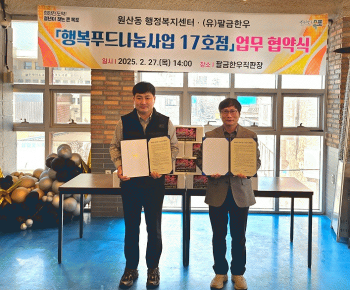 황성용 원산동장은 “지역 주민을 위해 나눔가게 협약에 동참해 주신 이영주 대표께 감사의 인사를 드리며, 앞으로도 지속적인 행복푸드나눔가게 발굴을 통해 행복한 원산동을 만들어 나가도록 노력하겠다”고 밝혔다.