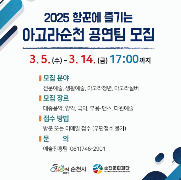 자세한 내용은 순천문화재단 누리집 공고문을 통해 확인할 수 있으며, 기타사항은 예술진흥팀으로 문의하면 된다.