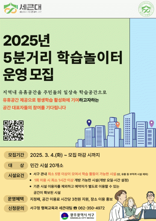 모집 대상은 서구 소재 도서관과 카페, 공방, 사무실 등으로 최소 5명 이상 학습 가능한 공간을 제공하며 1회 이용 시 최소 1시간 이상 개방할 수 있어야 한다.