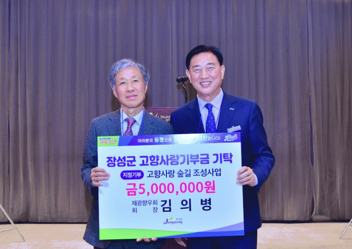 군에 따르면 지난 25일 재광장성군향우회 신년회에서 김의병 회장이 고향사랑기부제 지정기부사업인 ‘고향사랑 숲길 조성사업’에 500만 원과 장학금 500만 원, 총 1000만 원을 장성군에 쾌척했다.