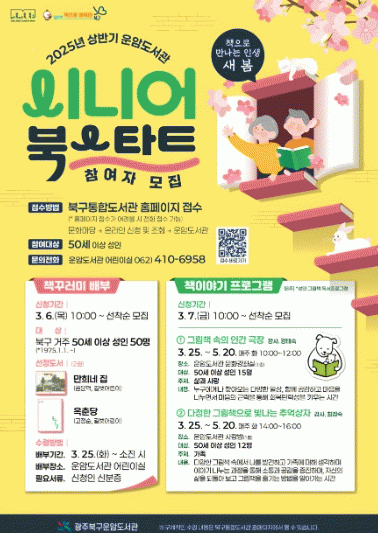 운암도서관(북구 북문대로 118)에서 진행되는 이번 사업은 ‘책으로 만나는 인생 새 봄’이라는 주제로 50세 이상 북구 주민에게 ‘책 꾸러미’를 배부하고 ‘책 이야기 프로그램’을 운영한다.