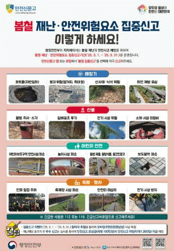 ‘안전신문고’는 국민 누구나 생활 주변의 재난ㆍ안전 위험 요소를 사진이나 동영상으로 촬영해 신고할 수 있는 시스템으로, 이번 집중 신고 기간에는 봄철 빈발하는 신고와 최근 이슈 등을 반영해 선정된 총 4개 유형을 운영한다.