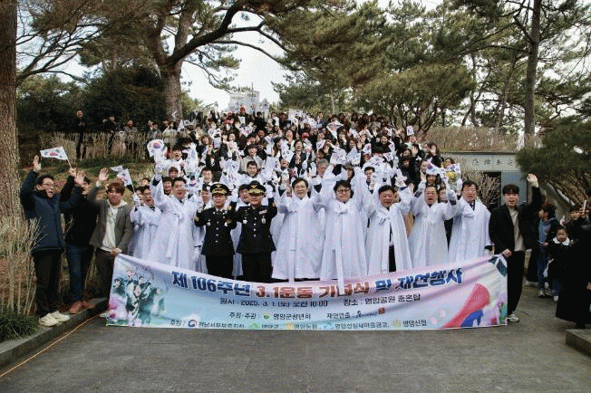 보훈단체 회원과 유족, 학생 등 200여 명이 참석한 이날 행사에서, 지역 고등학교 3학년 학생들은 독립선언문을 낭독하며 3·1절 재현에 나섰다.