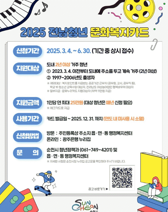 시 관계자는 “전남청년 문화복지 카드 지원사업이 일상에 지친 청년들에게 조금이나마 도움이 되길 바란다”며, “다양한 정책이 일상에서 체감될 수 있도록 아낌없는 노력과 지원을 다하겠다”고 말했다.